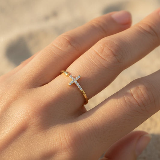 Elegant Open Cuff Ring - Sideways Cross Design in Gold Plating, Hypoallergenic