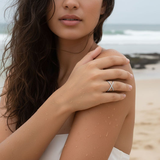 Elegant X-Shaped Stainless Steel Ring with Sparkling Crystals - Adjustable Fit
