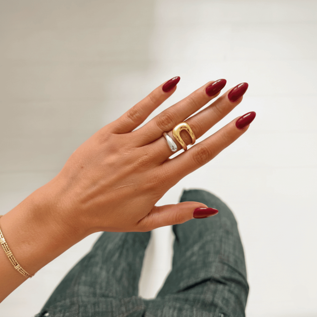 Este moderno anillo bicolor combina curvas escultóricas con una audaz silueta abierta, creando una pieza de declaración elegante y minimalista. Diseñado en tonos contrastantes de oro y plata, ofrece un aspecto elevado pero sin esfuerzo que combina maravillosamente con cualquier atuendo. Ligero, impermeable e hipoalergénico, está hecho para el uso diario con un brillo duradero.