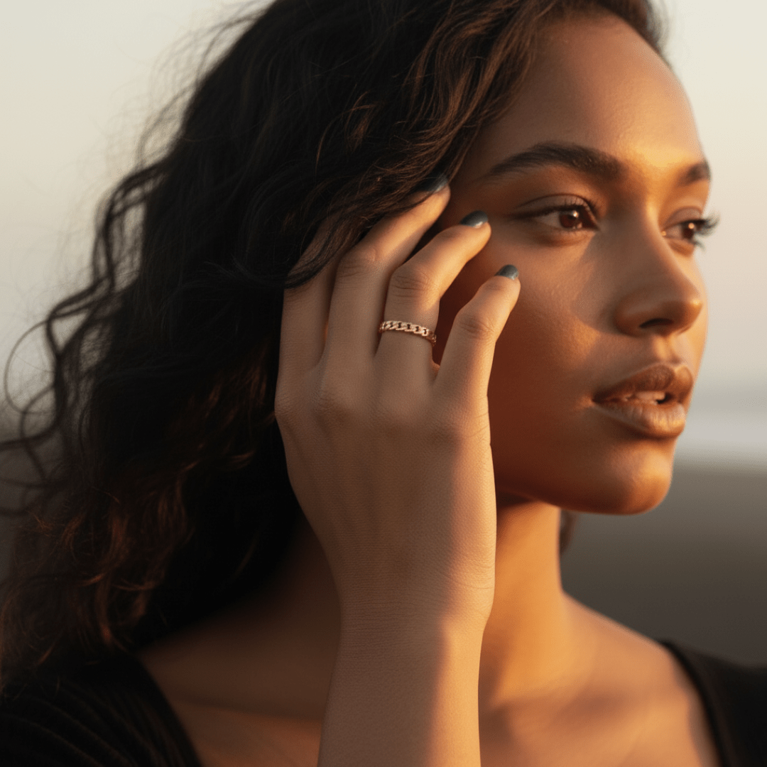 Proof that movement can be minimal, this Thin Cuban Link Ring captures the timeless strength of an anchor chain, refined into a piece of sleek, wearable elegance. Its design speaks to enduring connection and subtle confidence, blending a classic structure with a delicate form.