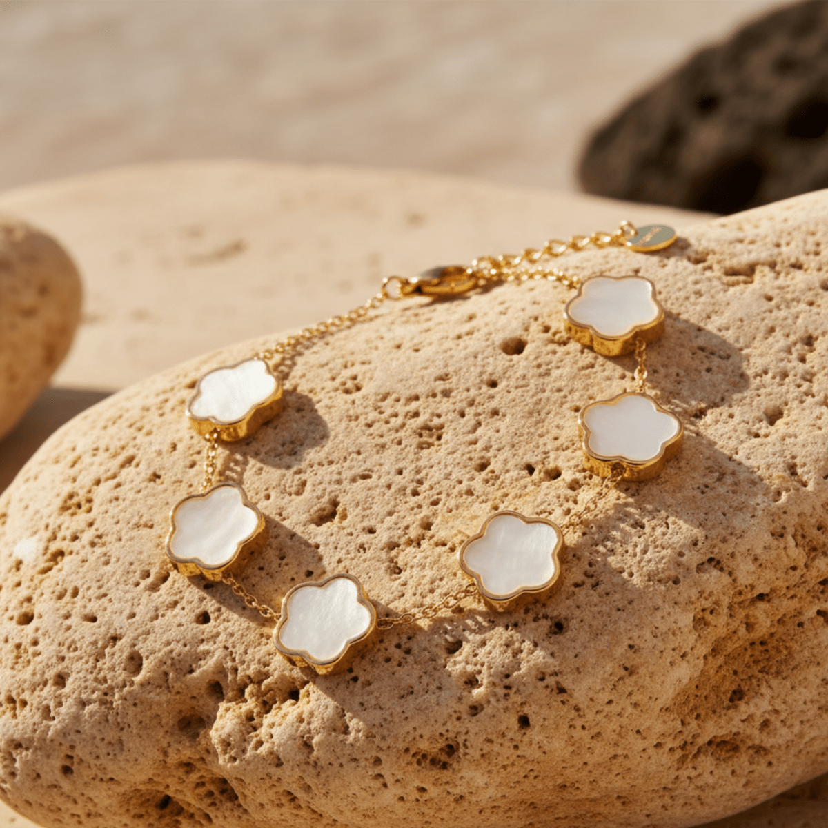 This stunning gold-colored bracelet features five exquisite flower-shaped links, blending romance and sophistication for your everyday wear. Crafted from high-quality, nickel-free, waterproof, and hypoallergenic stainless steel, this bracelet ensures durability and comfort without discoloration.