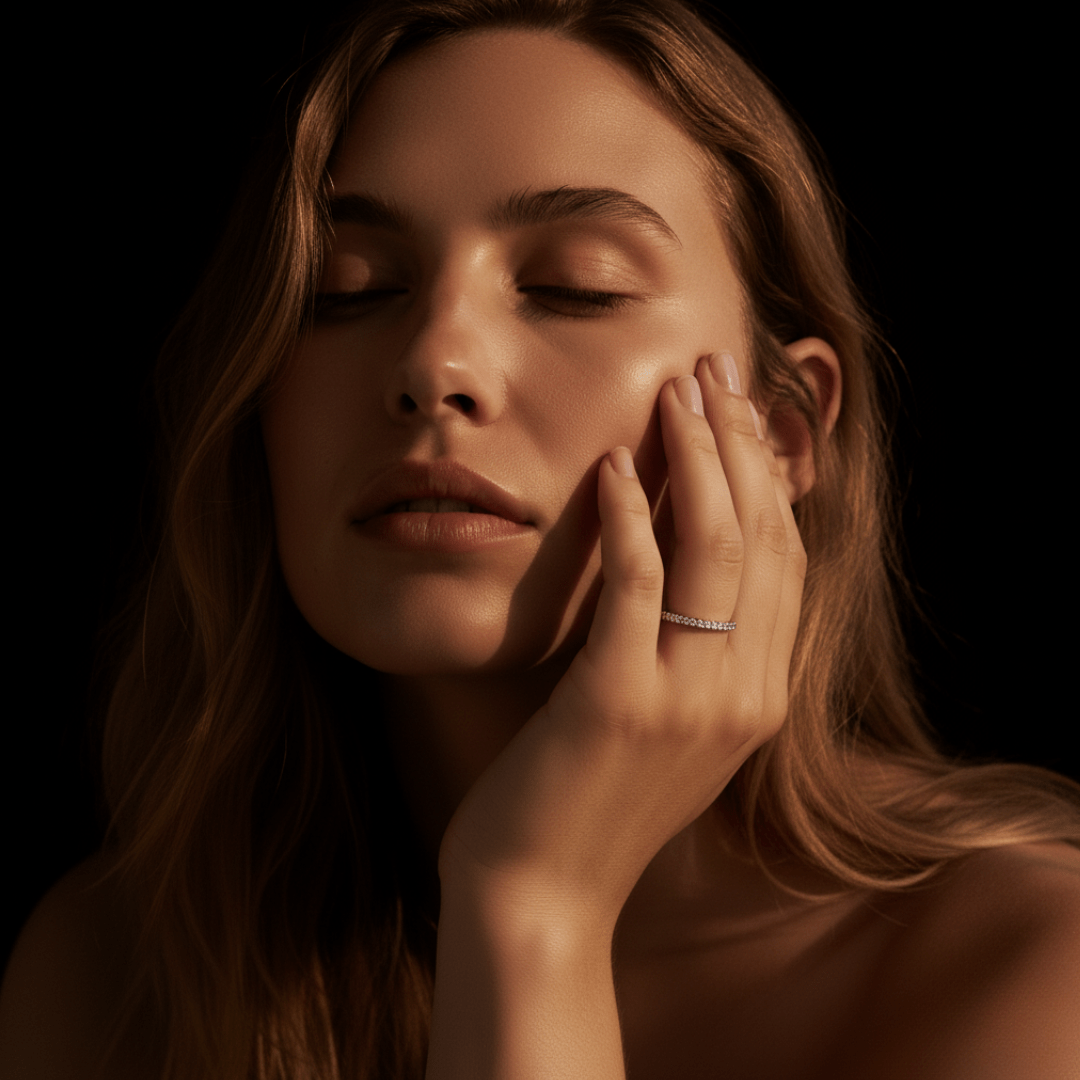 This Eternity Ring is a dainty, continuous line of light, designed to embody the timeless, effortless elegance of the coast. Its minimalist band glistens with a stunning, diamond-like sparkle, catching light and admiration from every angle.