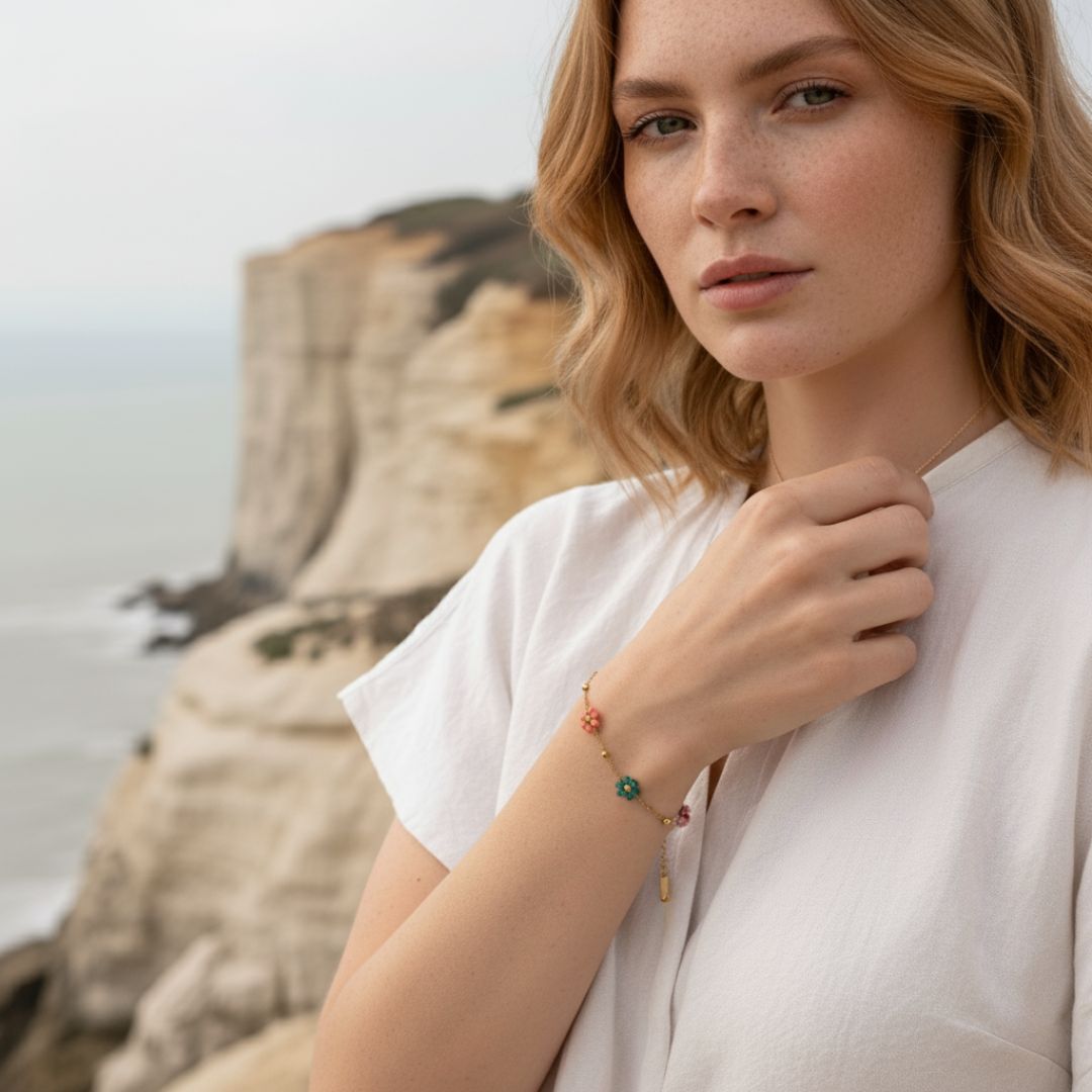 Floral Beaded Bracelet with Gold Coating - Handcrafted Colorful Design