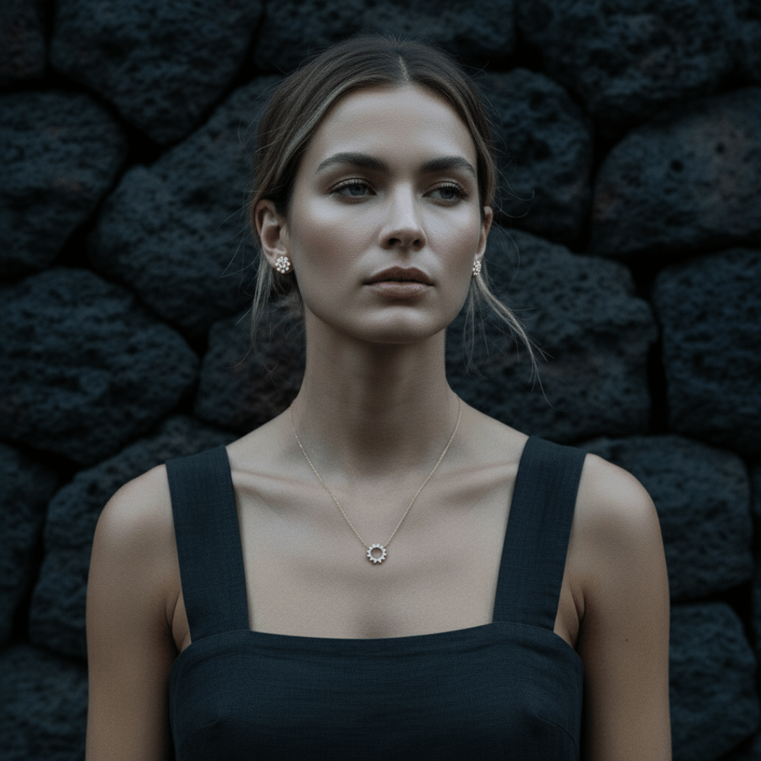 This Sunburst Necklace is inspired by the Midday Radiance—the brilliant, focused light of the sun at its highest point over the open water. It is designed to capture that powerful, pure glow and translate it into a piece of wearable, natural elegance.